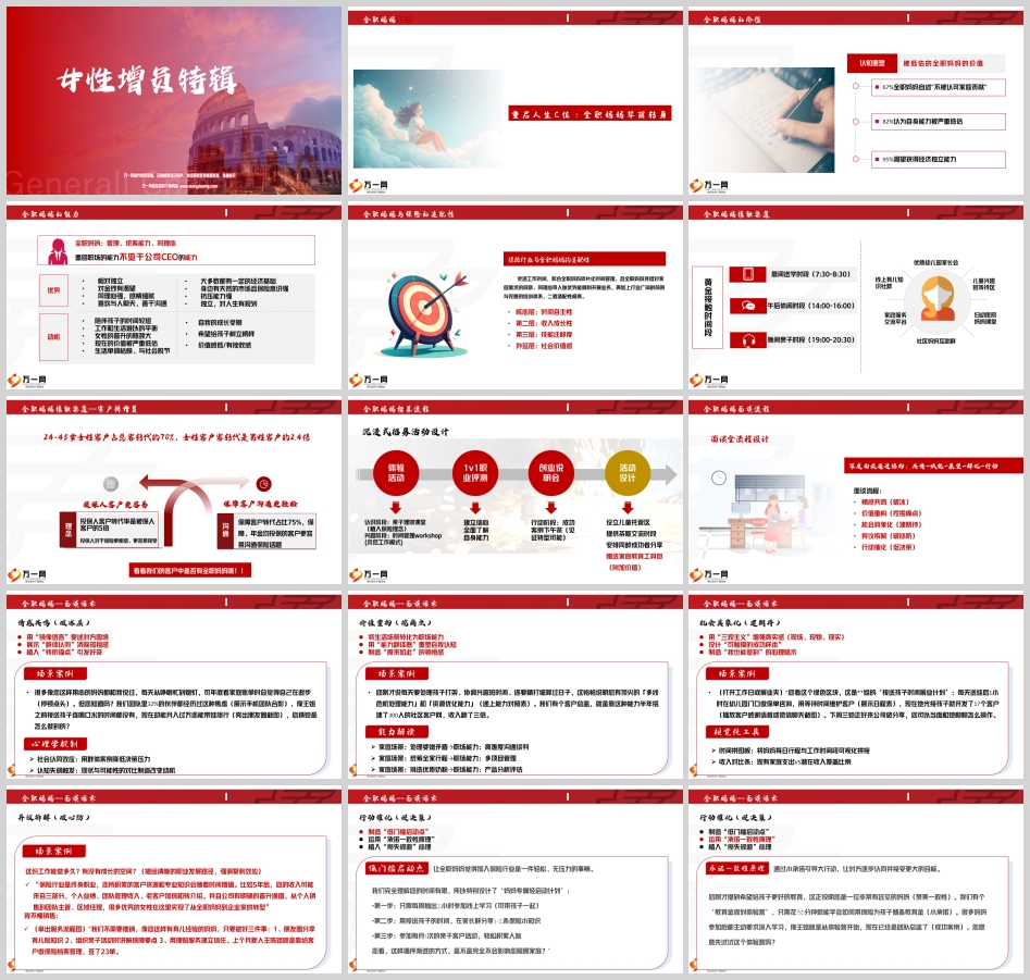 用“三观主义”增强真实感(现场、现物、现实),设计“可触摸的成功样本”,制造“我也能做到”的心理暗示:通过展示实际的工作案例和成功样本,让全职妈妈们看到保险行业的可行性和发展前景,增强她们的信心和动力。