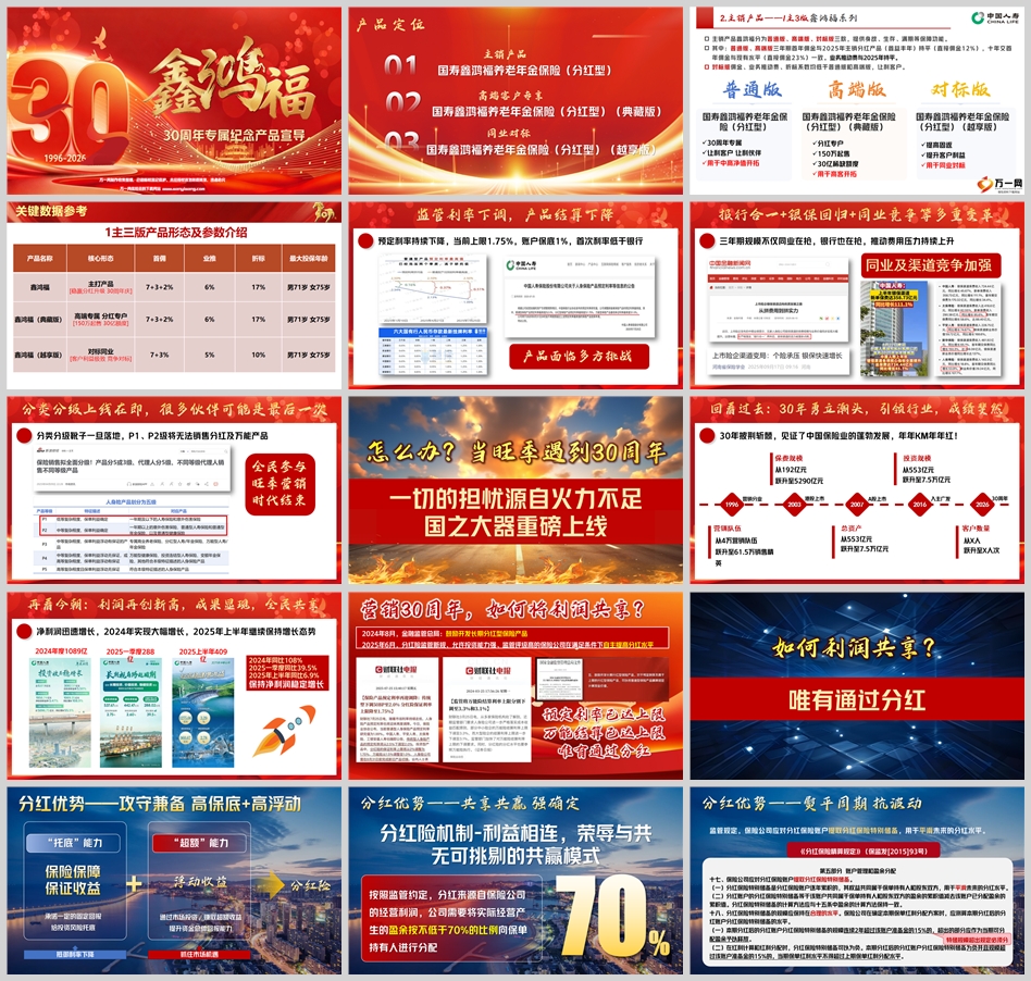 产品定位:30周年专属纪念产品,旨在通过分红、固收、万能账户等多重保障,为客户提供全面的养老规划和资产增值方案。