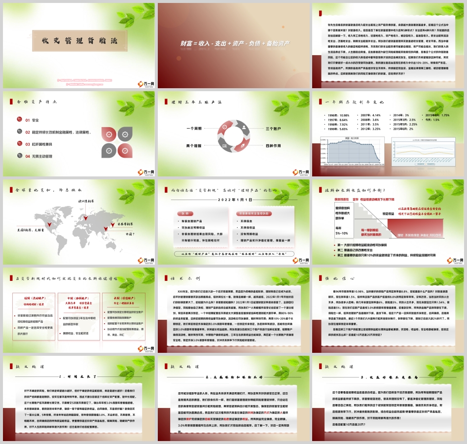 在与高客沟通时,首先需通过收支管理公式(财富=收入-支出=资产-负债)引导客户认知财富管理的本质是收支平衡。重点强调:收入的稳定性与持续性是财富安全的基石。收入包含工资性、经营性、资产性、被动型及备胎型五大来源,而支出则分为流动性、改善性、刚需性与意外性四大类别。当前经济环境下,工资性收入(如企业经营利润)与资产性收入(如房产增值)受市场波动影响显著,一旦收入中断(如企业亏损、投资失败)或支出激增(如子女留学、父母医疗),家庭财富将面临快速缩水的风险。