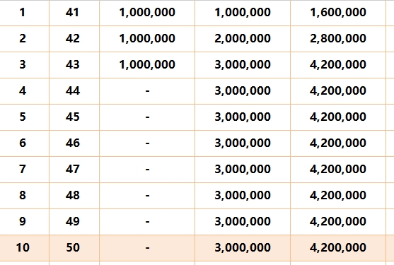 在缴费期内(前3年),每年年初缴纳100万元保费,到第1年保单年度末,身故保险金为1,600,000元,是已交保费的1.6倍;到第2年保单年度末,身故保险金为2,800,000元,是已交保费的1.4倍;到第3年保单年度末,身故保险金达到4,200,000元,是已交总保费300万元的1.4倍。缴费期结束后,身故保险金一直保持在4,200,000元,为投保人提供了稳定的身故保障,确保在被保险人身故后,家人能够获得一笔可观的资金,维持原有的生活水平。
