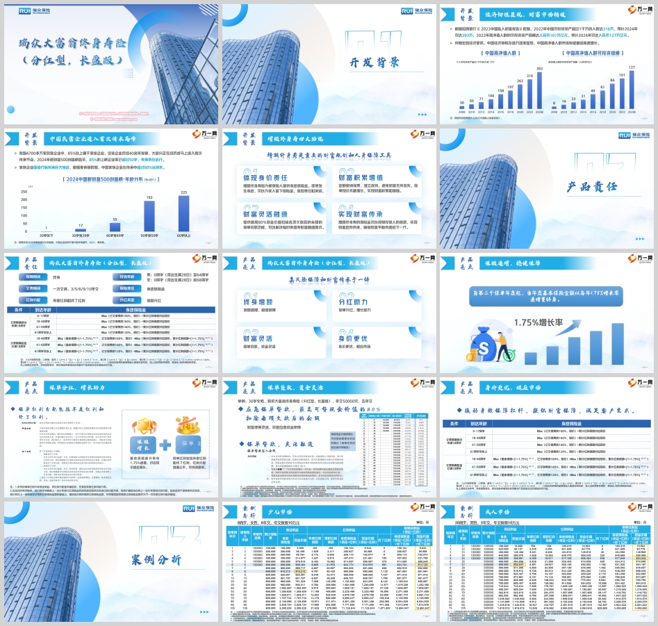 以60周岁女性,3年交,年交保费10万元为例,同样展示了在不同保单周年日的相关数据。这些案例分析为不同年龄段和不同需求的客户提供了参考,展示了瑞众大富翁终身寿险(分红型,长盈版)在不同市场中的应用价值和效果。