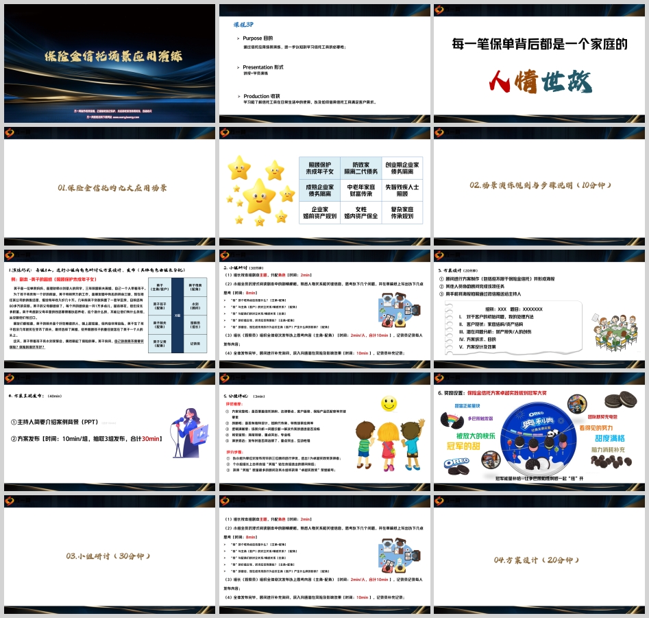 小组进行 30 分钟的研讨,结合前面的思考和沟通内容,共同探讨解决方案。然后,顾问进行方案制作(包括但不限于保险金信托),并形成海报。其他人员协助顾问完成该项任务,用手机将海报拍照通过微信推送给主持人。方案内容包括对于客户的初始问题,处理方法、客户现状(家庭结构/资产结构)、潜在问题分析(财产损失/人的创伤)、方案诉求、目的、方案设计及效果等。