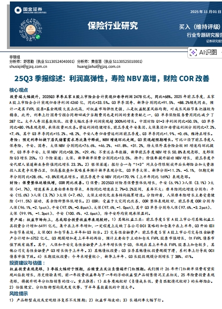 保险行业2025年三季报综述:利润高弹性释放,寿险NBV高增,财险COR显著改善