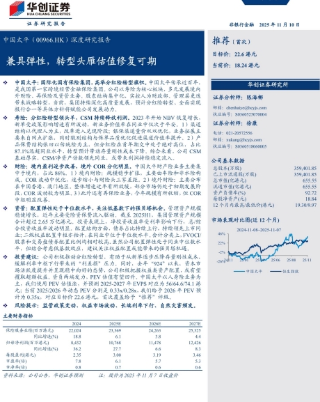 资负两端合力,有望共同推动公司内含价值(EV)的稳健增长与市场估值(PEV)的修复。采用PEV估值法,华创证券预测公司2025-2027年的每股内含价值(EVPS)分别为56.0、64.6和74.1港元。以2025年11月7日收盘价18.24港元计算,对应2025/2026年动态PEV仅为0.33x/0.28x,相较于其业务基本面的改善,估值明显处于洼地。基于此,报告给予公司2026年0.35倍PEV的估值,对应目标价22.6港元,相较当前股价有约24%的上升空间,首次覆盖并给予“推荐”评级。