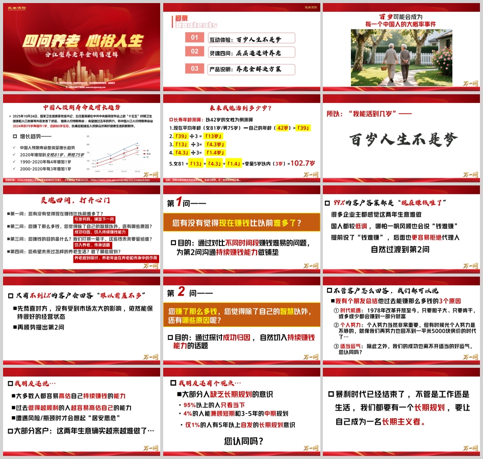 但长寿的背后,是养老挑战的指数级上升:活得更久,意味着需要更长时间的财务支持、更专业的医疗照护,以及更周全的传承安排。如何让“活得久”不等于“活得累”?如何让辛苦积累的财富既保障晚年尊严,又实现有序传承?这正是分红型养老年金产品的核心价值所在,也是销售人员需要向客户传递的关键命题。