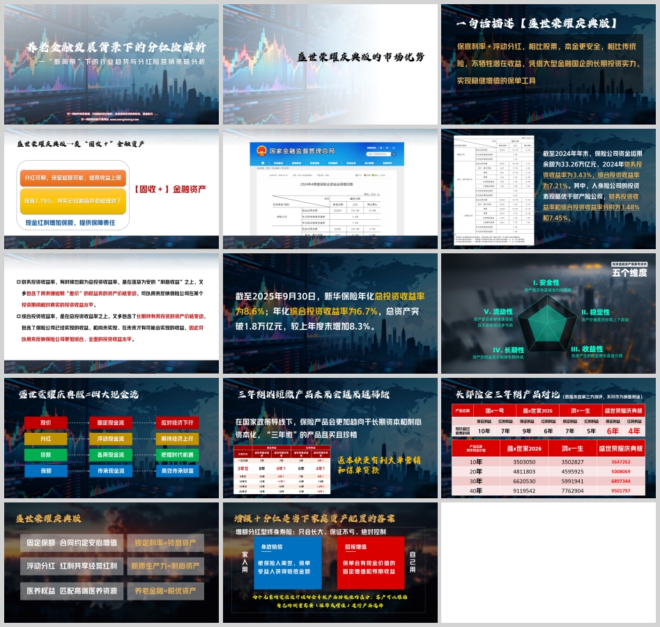 新华盛世荣耀庆典版以“保底+分红”的类固收+结构,在利率下行、资产荒与养老需求爆发的多重背景下,提供了兼顾安全与收益的优质解决方案。其与同业三年期产品的对比中展现出的返本快、现价高、分红可期、服务全等优势,使其成为新周期下分红险营销的标杆之作。