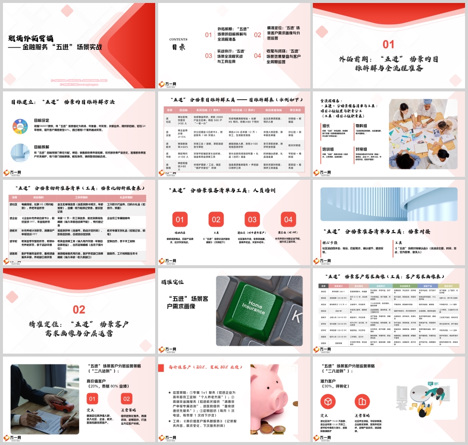 高价值客户(20%,贡献80%业绩):定义如进社区资产50万+、进企业年薪30万+等。运营策略为专属1v1服务、高端非金融服务(清廉资产申报咨询、重疾绿通优先)、定期回访。工具:《高价值客户服务跟踪表》。