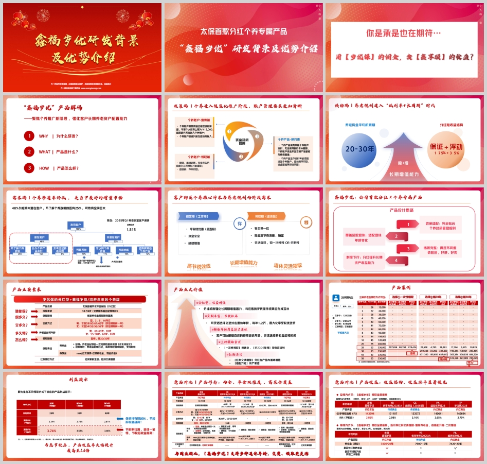 产品形态创新:与市场上主流的传统型个人养老金产品不同,“鑫福岁优”引入了分红机制,形成了“保证收益+浮动分红”的双重收益结构。这一创新不仅提升了产品的长期收益潜力,也使其与太保在售的“岁优保”传统型两全保险形成互补,为客户提供了更丰富的产品选择。