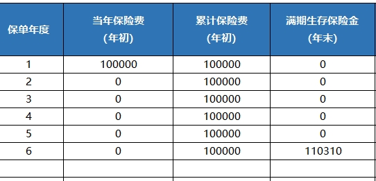 这是“生存保障”功能的直接体现。在保单第六个年度末,若被保险人生存,将一次性获得110,310元。这意味着,在绝对安全(保险合同刚性兑付)、无市场波动风险的条件下,初始投入的10万元本金在六年后实现了10,310元的绝对收益增长。这是产品储蓄功能的最终兑现,为规划中的财务目标(如教育金、旅行基金、小额创业金等)提供了确定的资金来源。