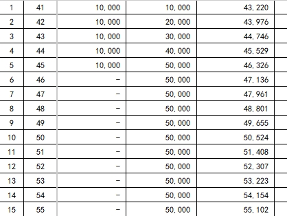 第1年基本保额43,220元,第2年43,976元,第3年44,746元……至第10年达50,524元,呈稳定递增趋势。