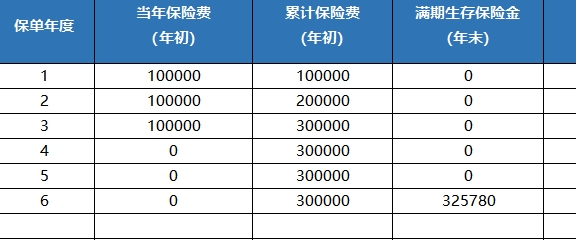 现金价值:反映保单在年末的退保可领取金额。第1年末83,670元(约为首年保费的83.7%),第3年末294,250元(接近累计保费的98%),第6年末等于满期生存保险金325,780元。