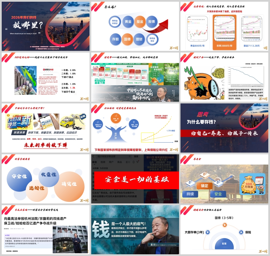· 高收益端:黄金(800元/克)、股票(3888元/股)、基金(7113.28元)等资产,收益潜力大但非保证,且受市场情绪驱动明显——“大家的贪婪冲高了指数,此时很危险”(巴菲特“别人贪婪我恐惧”的警示恰逢其时)。