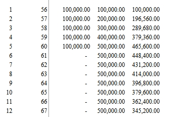 现金价值:前期快速增长,第5年末现金价值达46.56万(接近已交保费50万),第7年末(62岁)后稳定在40万左右,为资金周转提供流动性。