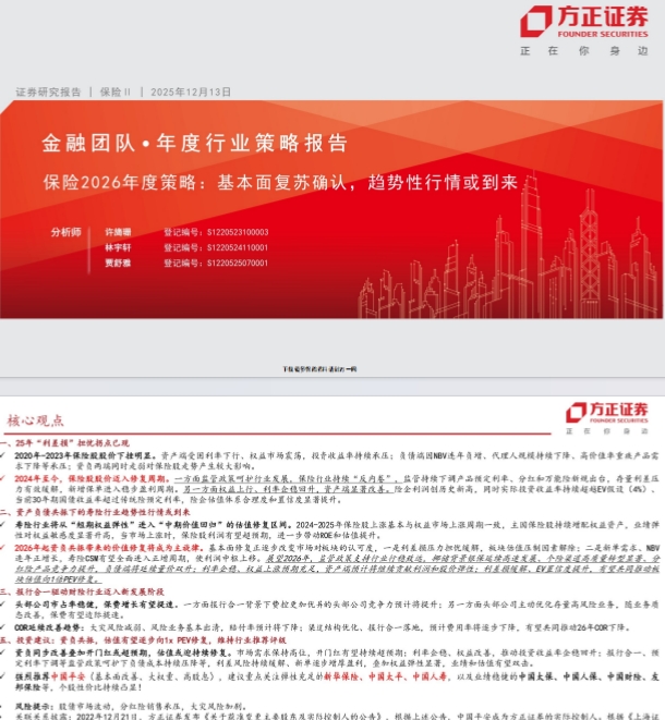 2024-2025年,保险股的上涨很大程度上依赖权益市场的“顺风车”,弹性较大。而进入2026年,市场逻辑有望切换至“中期价值回归”,核心驱动力来自资产负债的共振改善。