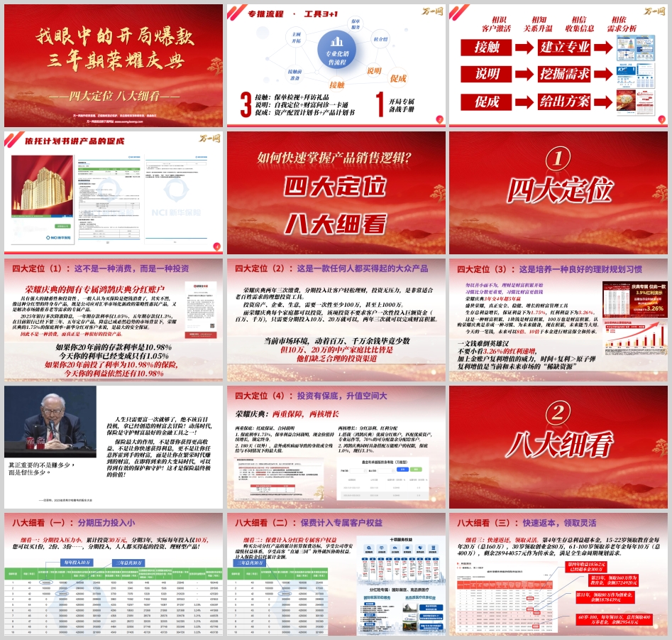 促成:核心依赖“资产配置计划书”与“产品计划书”。前者从宏观上论证保险在家庭资产中的必要性与比例;后者则具体化“盛世荣耀”如何解决客户的教育、养老、传承等具体问题,将产品的利益演示与客户的人生愿景紧密绑定。