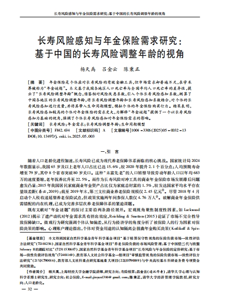 关键词: 长寿风险;风险感知;年金保险;风险调整年龄;老龄化;行为经济学