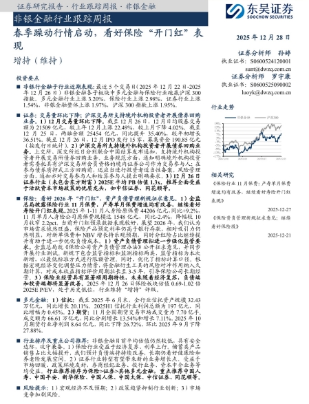 2025年岁末,中国金融市场正经历着一场深刻的变革与重构。随着宏观经济数据的逐步改善、政策环境的持续优化以及市场信心的稳步修复,非银金融行业迎来了久违的“春季躁动”行情。在这场由预期驱动的市场回暖中,保险行业凭借其独特的顺周期特性、稳健的盈利模式以及“开门红”的强劲表现,成为非银金融板块中最具看点的细分领域。东吴证券最新研报显示,最近5个交易日(2025年12月22日-12月26日)保险行业上涨2.98%,跑赢沪深300指数1.95%的涨幅,显示出市场对保险板块的强烈关注与乐观预期。