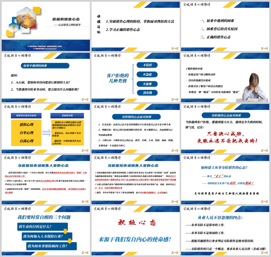 正如课程结束语所言:"只有良好的心态才能保证最终的成功,而消极的心态、负面的思想注定了最终的失败。成功并不神秘,那就是积极的心态、必胜的信念!"对于华泰人寿的特聘顾问而言,突破销售心理障碍的关键,不在于战胜客户,而在于战胜自己——战胜恐惧、自卑与自满,用"义工心态"传递爱与责任,用科学方法应对挫折,用积极信念照亮前行的道路。这,就是销售的艺术,更是人生的智慧。