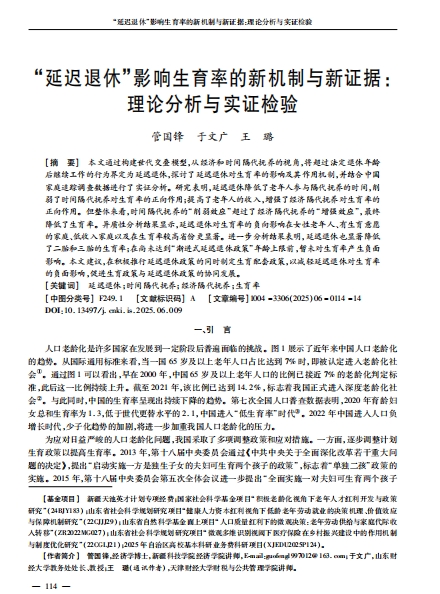 本文通过理论模型与实证检验,系统分析了延迟退休通过时间隔代抚养和经济隔代抚养影响生育率的新机制。研究发现,延迟退休主要通过减少老年人提供的孙辈看护时间,显著抑制了育龄家庭的生育意愿和行为,而经济支持的补偿作用有限。这种负面影响在不同群体中存在异质性,并与二胎、三胎政策形成冲突。