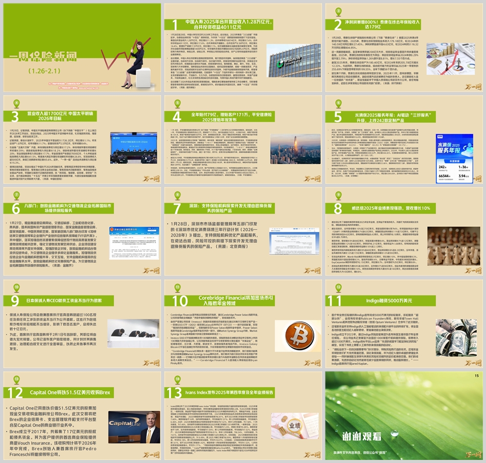 1月28日至29日,中国人寿在京召开2026年工作会议。会议指出,2025年集团“333战略”平稳起步,以最佳业绩实现“十四五”顺利收官,为开创“十五五”高质量发展新局面打下坚实基础。集团合并营业收入1.28万亿元,同比增长11.3%;合并保费收入8874亿元,同比增长7.4%;合并投资收益4011亿元,同比增长17.6%;合并净利润大幅增长;合并总资产8.56万亿元,同比增长14.4%;管理资产规模17.5万亿元,同比增长11%。经济减震器和社会稳定器功能更好发挥,为经济社会提供风险保障金额超1400万亿元,投资服务实体经济增加8000亿元达到5.4万亿元。风险防控有力有序有效,寿险公司、财险公司、养老险公司风险综合评级,资产公司年度监管评级均获行业最高等级。