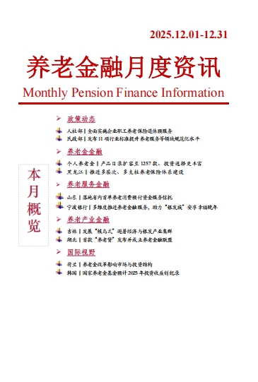 2025年步入尾声,我国养老金融领域呈现出“顶层设计精细化、市场创新多元化、服务延伸人性化”的鲜明特征。从人社部的“退休预服务”到各省市特色金融产品的涌现,从行业标准的规范到“银发经济”产业集群的培育,多维度、多层次的养老服务体系正在加速形成。本期资讯集中反映了在人口老龄化持续深化的背景下,政策制定者、金融机构与市场主体如何协同发力,通过制度优化、产品创新与生态建设,提升养老保障的可持续性与服务温度,为“银发族”安享晚年构建更为坚实的金融与社会支撑。