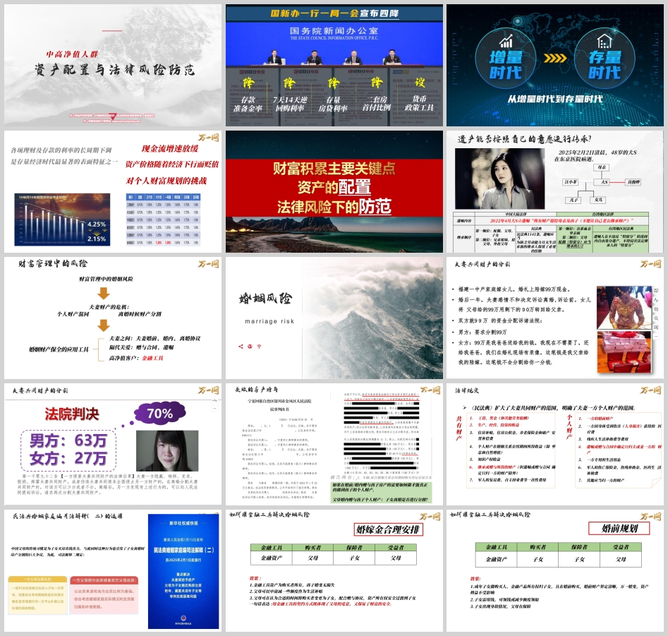 正如财富管理领域的箴言:"重要的不是预测未来,而是提前规划,当风险来临时可以从容应对。"在存量经济时代,利率下行与资产贬值已不可逆转,而婚姻变动、代际传承、企业债务等法律风险却呈加剧态势。高净值客户亟需转变"重收益、轻架构"的传统思维,将保险等金融工具纳入资产配置的核心圈层,通过法律架构设计实现婚姻财产保全、精准财富传承及债务风险隔离。唯有如此,方能在经济周期的波动中守护家族财富的安全与永续。