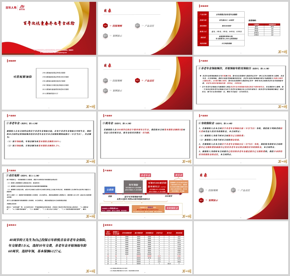 假设王先生健康长寿至100周岁,在享受了40年的稳定养老金后,还将一次性获得30635元的祝寿金(5倍基本保额:5 * 6127)。至此,保险责任圆满结束。