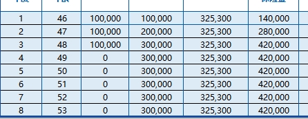 第8年末 | 30万 | 42万 | —— | 32.53万 | 35.36万 | |