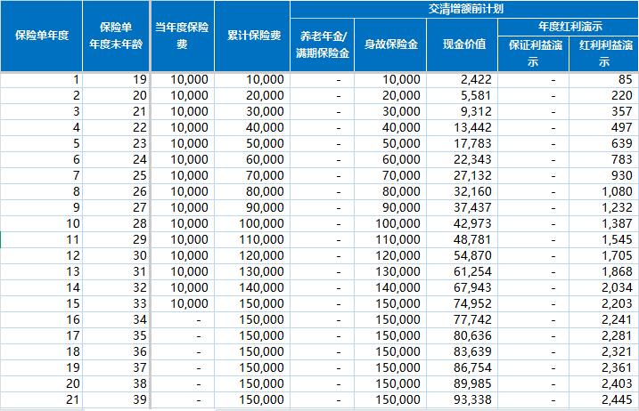 “交清增额”的魅力:表格中“红利购买交清保额比例”一列设定为100%,意味着投保人选择了将每年的现金红利作为一次性保费,购买额外的“交清增额保险”。