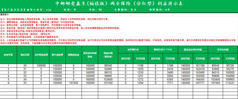 在当今复杂多变的经济环境下,人们对于财富规划和风险保障的需求日益增长。两全保险作为一种兼具保障与储蓄功能的保险产品,受到了众多消费者的关注。中邮邮爱鑫生(福禧版)两全保险(分红型)以其独特的产品设计和利益演示,为30岁的男性客户提供了一种为期6年的财富与保障规划方案。