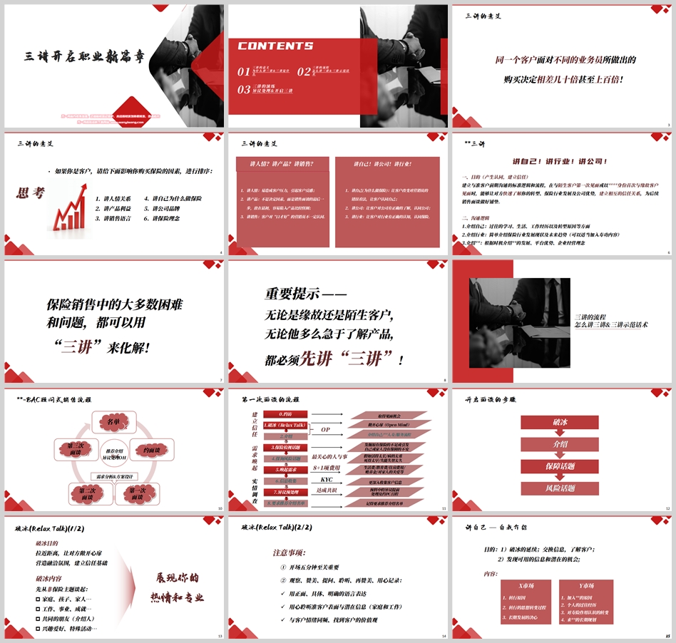 可以毫不夸张地说,保险销售中的大多数困难和问题,都可以用“三讲”来化解! 因此,无论你的客户是熟人还是陌生人,无论他多么急于了解产品,在正式进入产品环节之前,都必须先完成“三讲”。这是整个销售流程的基石。