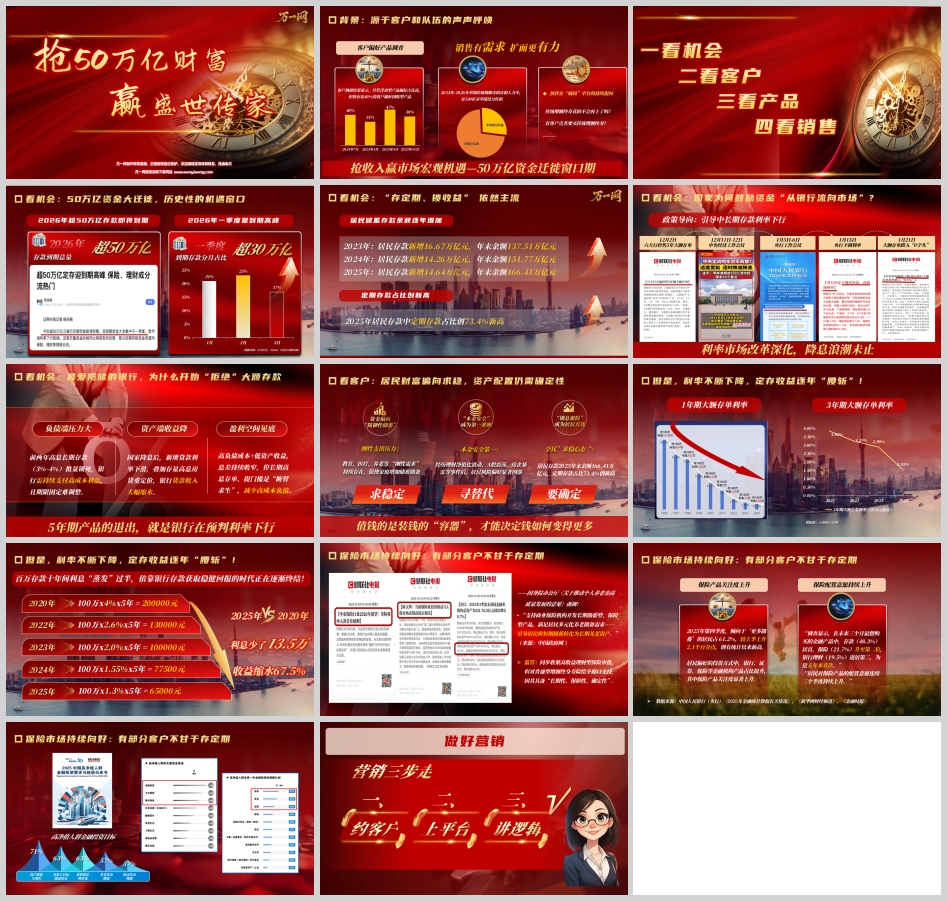 1. 看宏观:利率下行是大势所趋。展示近5年存款利率变化曲线,让客户直观感受“利息腰斩”的事实。