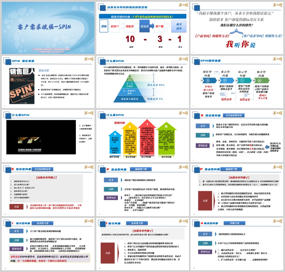 真正的销售高手明白:客户购买的不是保险产品本身,而是产品能为他解决的风险与问题。SPIN销售法正是破解这一误区的钥匙——它通过一套科学的提问流程,将客户的"潜在需求"转化为"明确需求",让客户主动意识到:"我需要这个解决方案"。