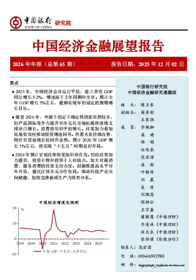 展望2026年,外部不稳定不确定性因素依然较多,但中国产品国际竞争力提升和多元化市场拓展将继续支撑出口增长。消费将保持平稳增长。政策有望前置发力、更加给力,叠加低基数效应,投资增速将有所回升。新质生产力加快培育,生产端继续维持平稳增长。供需关系持续改善,物价有望延续企稳回升态势。综合判断,预计2026年GDP增长5%左右,将实现“十五五”时期良好开局。
