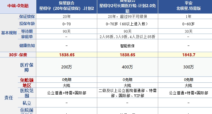 第一轨:0免赔产品主打“理赔无门槛”,适合追求极致体验、希望“小病也能报销”的客户。这类产品保费相对较高,30岁年龄段集中在1800-2600元区间。