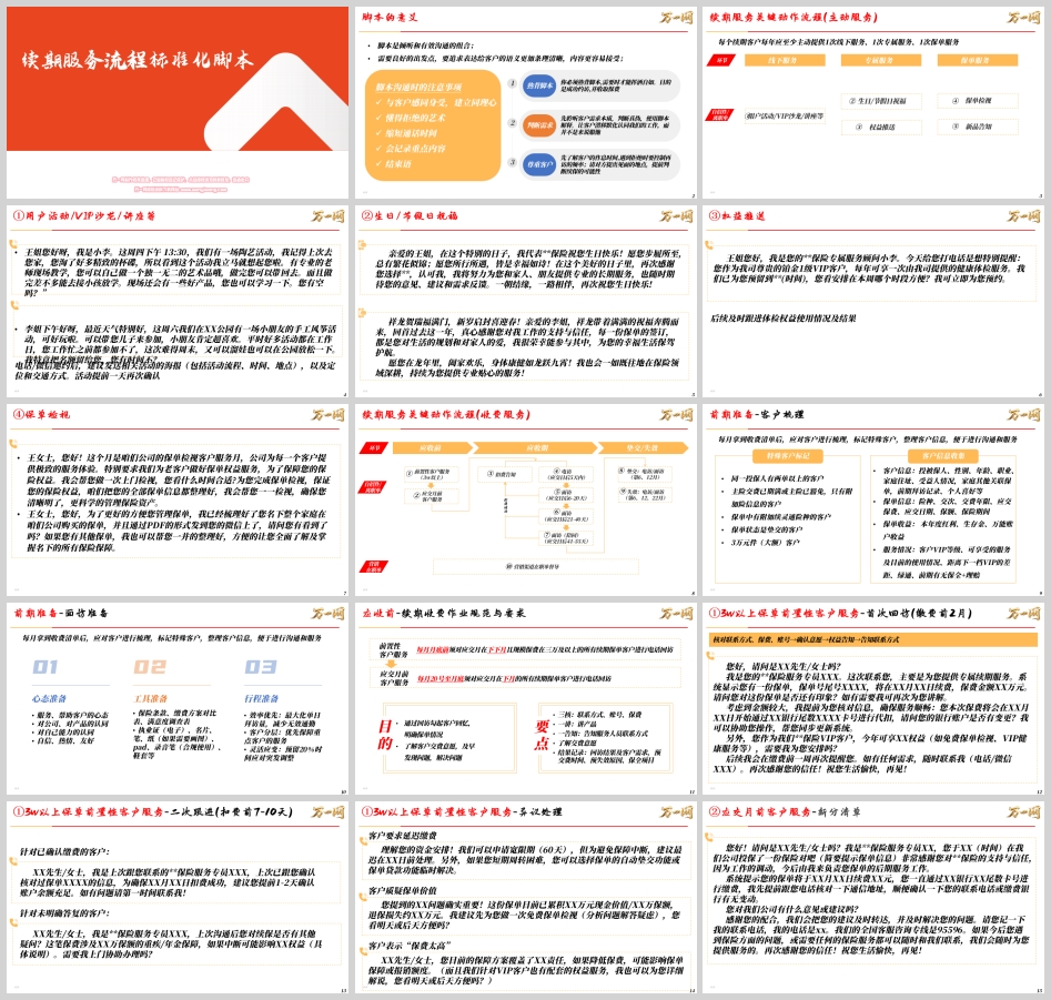 脚本将续期服务的关键动作提炼为三个层次:线下服务、专属服务、保单服务,并明确要求每个续期客户每年应至少获得这三种服务各一次。这构成了稳固客户关系的黄金三角。