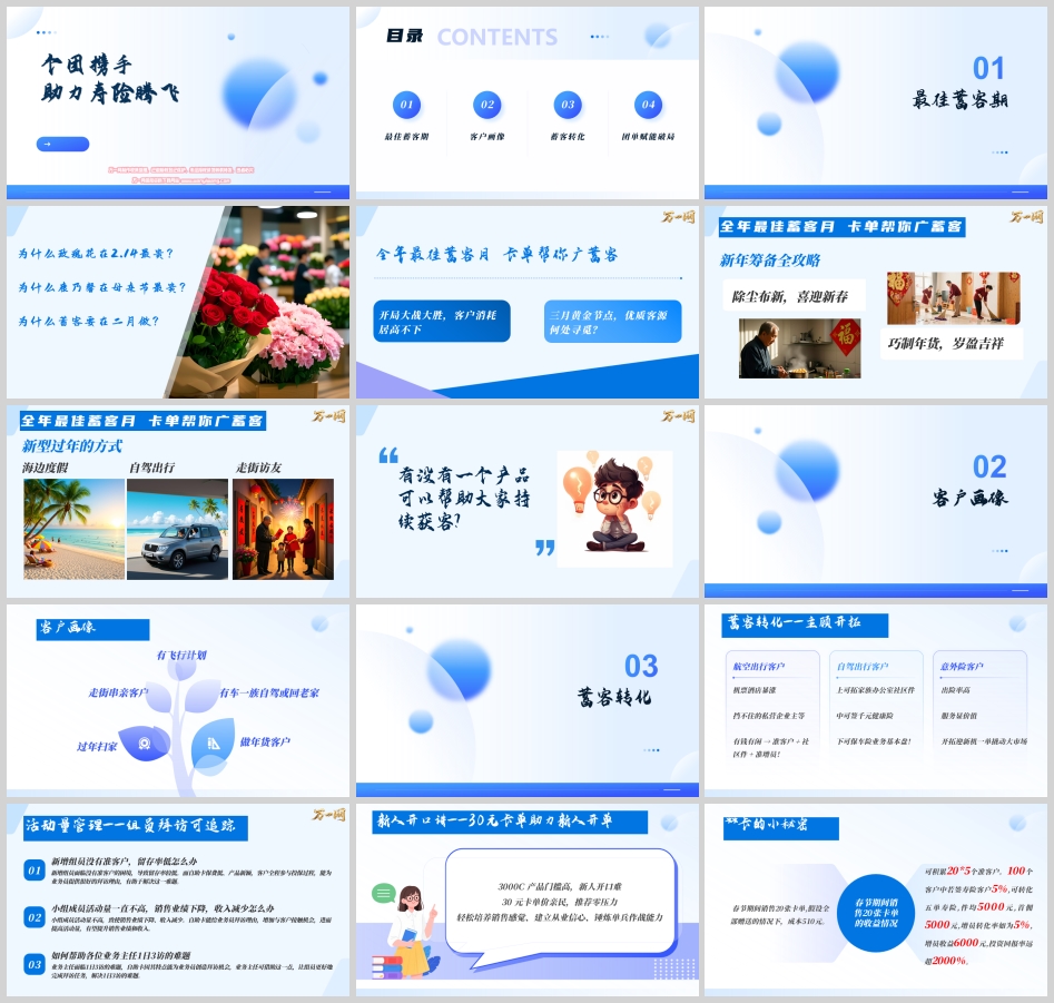 卡单以其“保费低、保障实、场景强”的独特优势,成为二月蓄客期的“获客神器”。无论是驾乘意外卡、出行无忧卡,还是短期旅游卡,都能精准切入客户在春节期间的各类活动场景,为我们提供源源不断的拜访理由和接触点。
