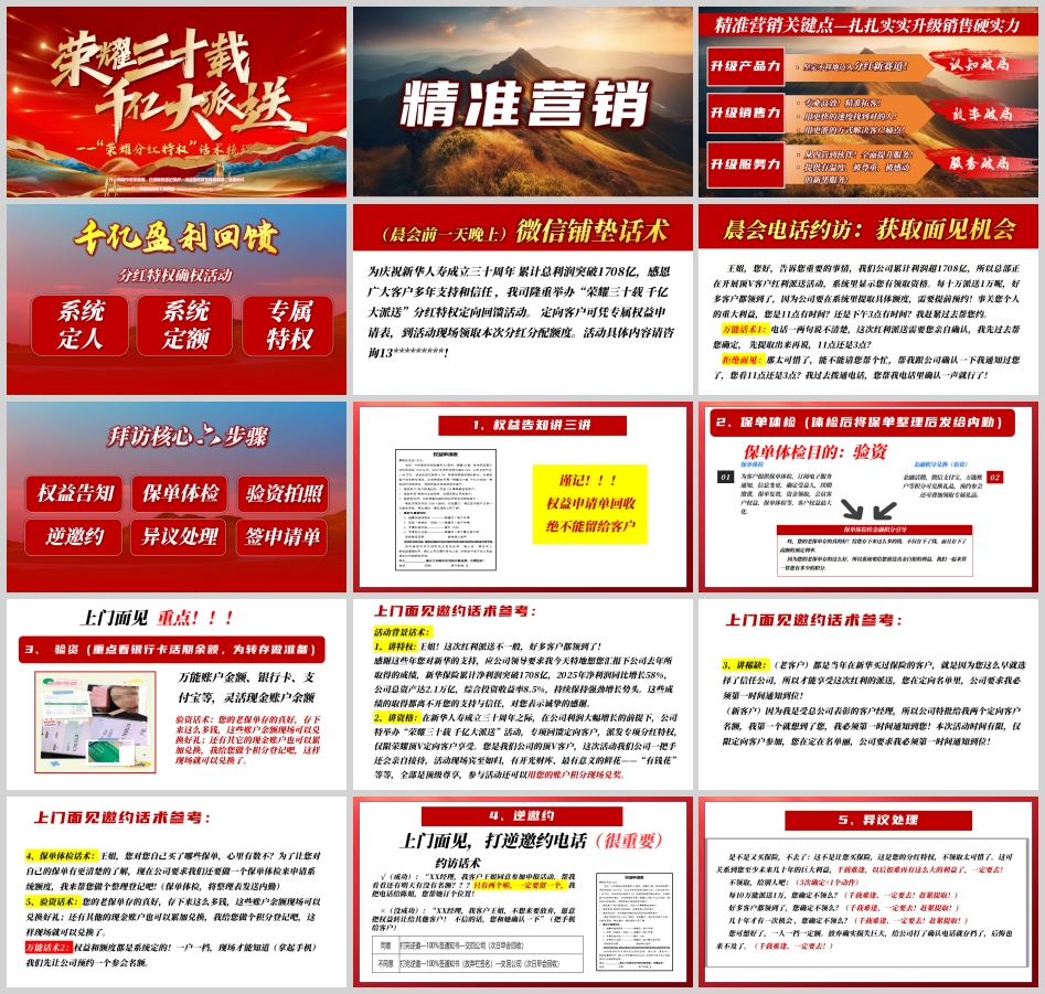 在寿险行业迈入“分红新赛道”的关键节点,新华保险以“荣耀三十载 千亿大派送”分红特权确权活动为抓手,通过精准营销、系统赋能与服务升级,打造了一场兼具稀缺性、仪式感与财富价值的顶V客户服务盛宴。这场活动不仅是公司对1708亿累计利润的诚意回馈,更是通过“六步拜访法+顶V话术”的组合拳,将“分红特权”从概念转化为客户可感知、可参与、可落地的财富增值方案。以下从活动逻辑、执行细节与话术精髓三个维度展开深度解析。