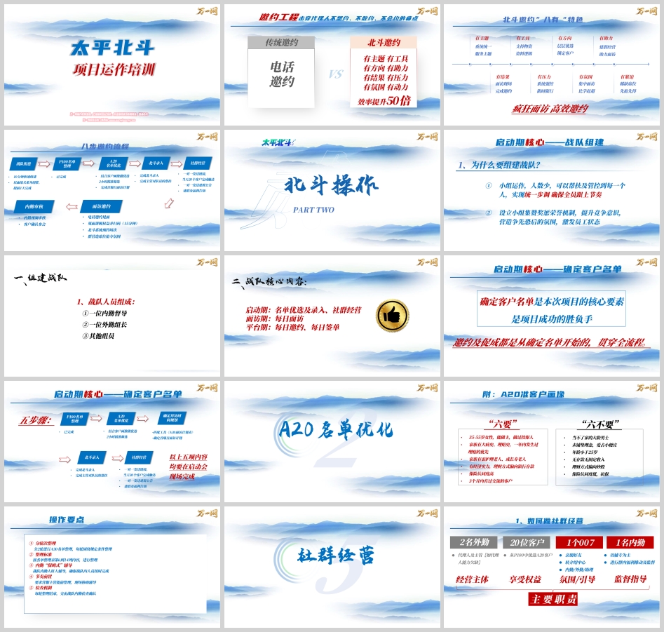 它通过将复杂的营销过程拆解为可复制、可追踪、可管控的标准动作,让每一位代理人都能清晰知道自己“在什么时间、做什么事、用什么工具、达成什么结果”。战队组建、名单优化、社群经营、面访邀约、内勤审核、平台运作——每一个环节都有明确的操作要点和标准要求。