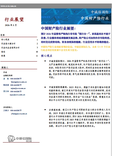 展望2026年,中国财产险行业将步入一个以“稳健”和“质效”为核心关键词的新阶段。在监管政策的持续引导下,行业将加速从规模扩张向高质量发展转型。非车险“报行合一”的严格执行将成为优化承保盈利的关键抓手,而车险业务在新能源转型与综改深化中维持稳定。同时,资产端在利率下行背景下,通过增配债券和高分红股票寻求收益与风险的平衡。行业整体信用水平预计保持稳定,但“马太效应”将愈发显著,头部公司凭借其综合优势强者恒强,而部分中小险企在承保端将面临更为严峻的生存挑战。