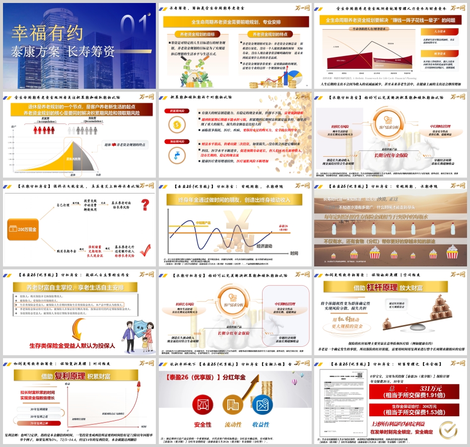 通过保险的杠杆与复利原理,帮助客户更有效率地进行筹资;通过实现安全性、流动性、收益性的金融三性统一,在低利率环境下为客户构建稳健的财富基石;通过万能账户的搭配,赋予客户更多灵活规划的空间;并依托泰康强大的专业资管能力,为客户打造穿越周期的长期复利曲线。