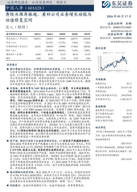 从负债端的“量质双升”到资产端的“收益稳健”,从业务结构的持续优化到“保险+服务”的生态构建,中国人寿正以“头雁”之姿,在寿险行业的新周期中展翅高飞。当前0.7x左右的2026E PEV估值,不仅反映了市场对其短期业绩的谨慎预期,更暗藏着对行业长期价值的低估。随着公司业绩增长动能的进一步释放,以及市场对龙头险企认知的纠偏,中国人寿的估值修复之路或将开启。对于投资者而言,这只“寿险头雁”不仅是分享行业红利的优质标的,更是穿越周期、实现财富稳健增值的长期选择。