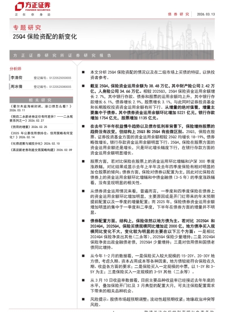 股票:沪深300指数1-2月上涨3.5%,保险股票配置环比增速回升至4.0%,或对市场形成支撑。