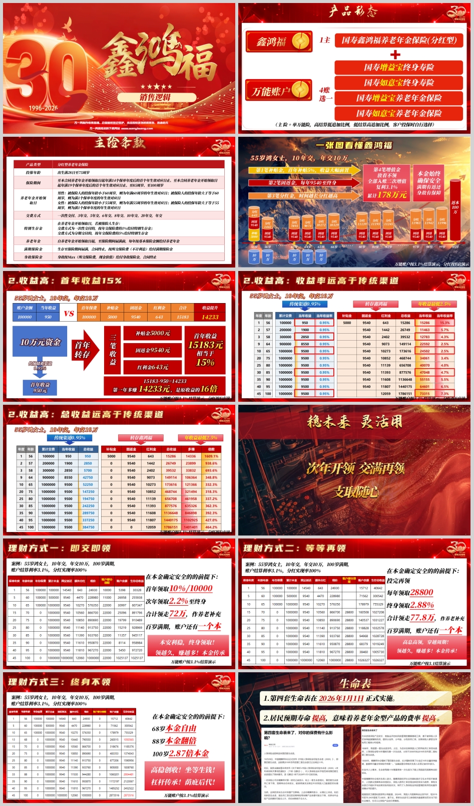 为了让客户理解产品的灵活性,资料中设计了三种典型的理财方式。我们选取最具代表性的案例——55岁鸿女士,10年交,年交10万进行深度推演(假设万能账户按3.1%结算,分红实现率100%)。