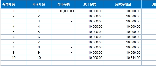 前9年:身故保险金等于“累计保费”或“现金价值”的一定比例(根据演示表,首年身故即返保费10,000元,后续逐渐接近满期金)。实际上,对于未成年人,身故保险金通常有限制,此处演示简化了。