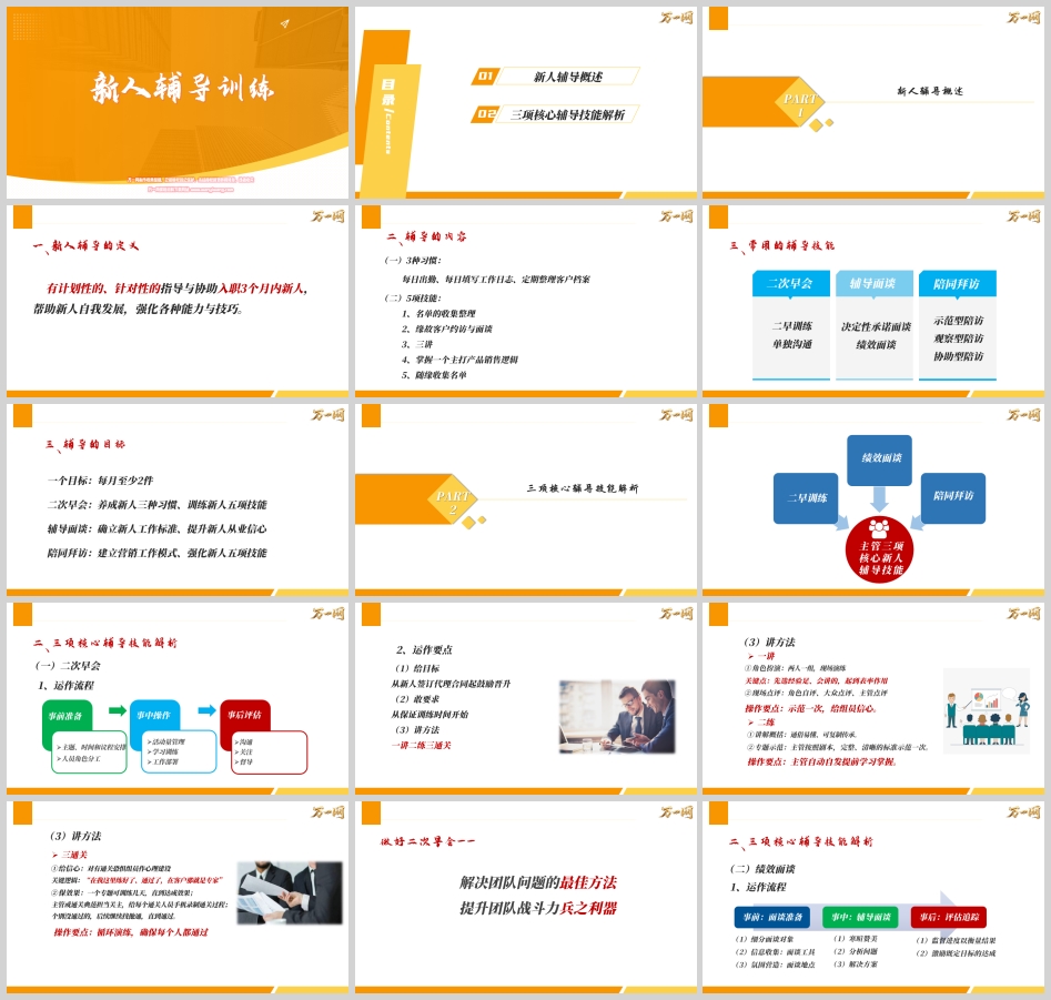 辅导面谈:目标是确立新人工作标准、提升新人从业信心。通过一对一沟通,解决个性化问题,校准发展方向。