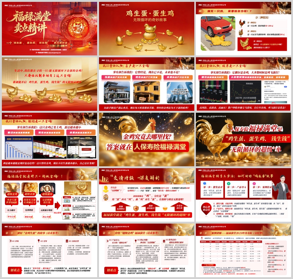 核心要点:把福禄满堂比作“超级金鸡”,将“交清增额”功能比作“鸡生蛋、蛋生鸡”的通俗比喻,让客户直观理解分红能自动增加保额,实现保障与财富的复利增长。