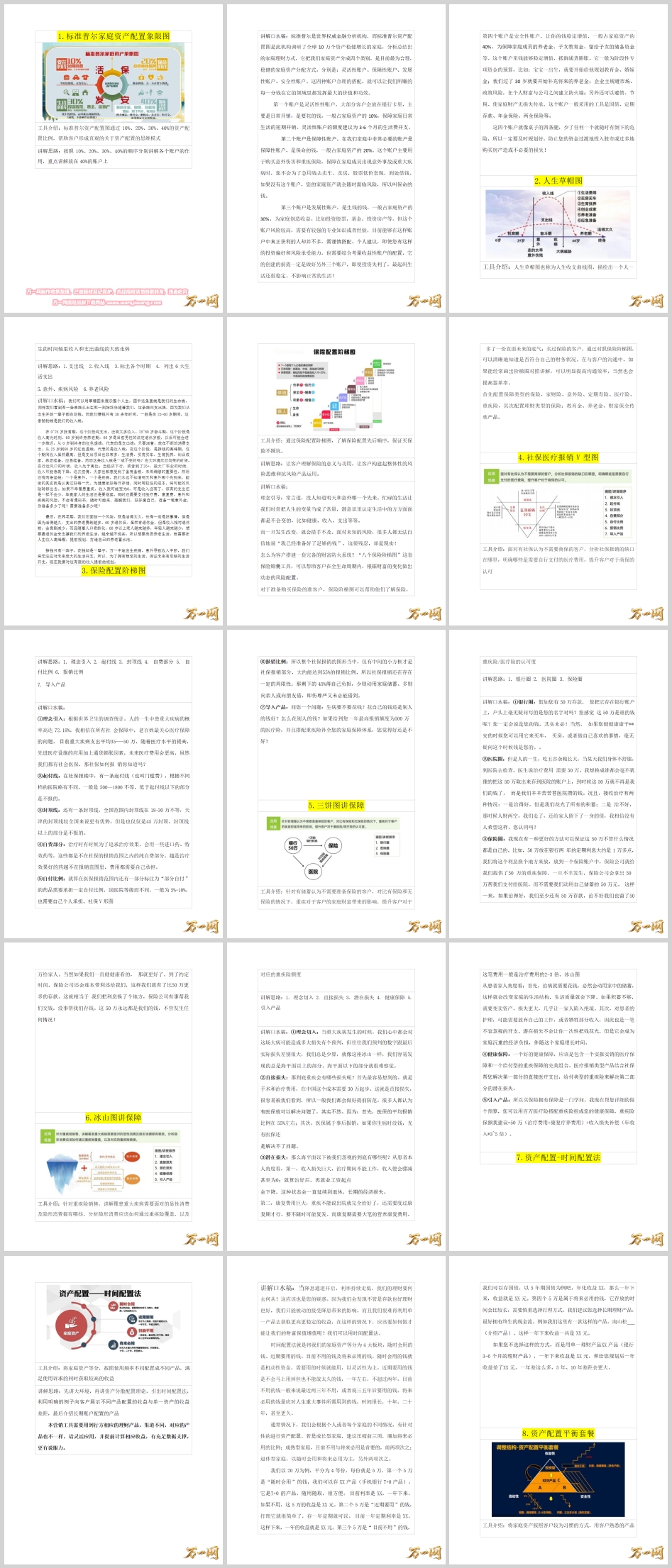 以上16张图构成了保险新人展业的完整工具体系。核心逻辑可概括为:用标准普尔图建立资产配置框架→用草帽图和冰山图激发风险意识→用V型图和三饼图解决社保和储蓄异议→用养老专题图锁定长期需求→用不可能三角和帆船图建立专业信任→用平衡套餐和阶梯图促成产品配置。