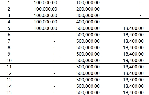 第10年末:已领年金18,400×6=110,400,50万 – 11.04万 = 38.96万,与表中“389,600”一致。