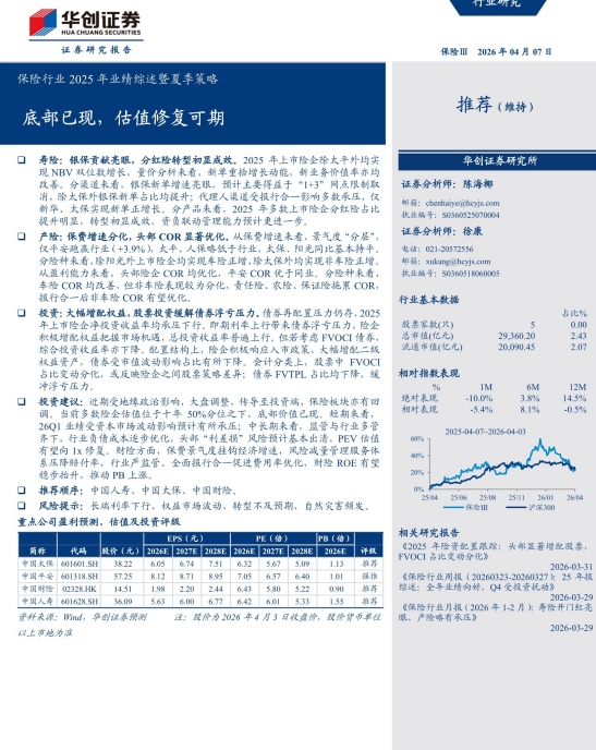 2025年保险行业年报展现出一个清晰的图景:银保崛起、分红险转型、资负联动能力提升,行业正从规模导向转向价值导向。短期估值回调为中长期布局提供了较好的安全边际窗口。对投资者而言,当前保险板块的配置价值主要来自三个方面:估值修复的空间、负债成本优化的确定性,以及头部险企在保险+服务生态中的差异化竞争优势。在行业底部已现的判断下,估值修复可期。